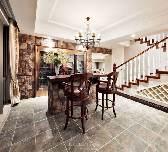 古典本與繁華的詩意共生,這盞鍛鐵吊燈卻在兼具復(fù)古優(yōu)美線條的同時(shí)將整體造型簡化,為這個(gè)休閑的私享領(lǐng)地注入靈動(dòng)清新的氣息,華貴質(zhì)感的皮質(zhì)吧凳完美契合美式鄉(xiāng)村的自在灑脫,整個(gè)水吧區(qū)在大地系配色下凝練出沉穩(wěn)古樸的精神氣質(zhì)。
