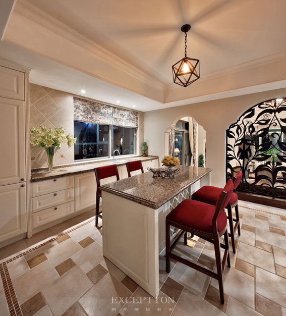 在廚房已有的照明基礎(chǔ)上,此時(shí)一盞簡單隨意的鐵藝吊燈便足以點(diǎn)亮這一室的氛圍,形似鉆石的立體幾何造型傳承了北歐血統(tǒng)的家居風(fēng)格,細(xì)致精巧;吧椅椅面包覆飽滿而雍容的石榴紅布藝,讓大地色系的空間充斥著跳躍的溫暖。