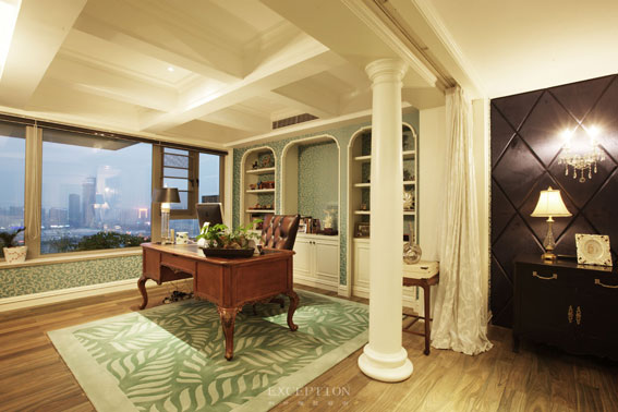 主臥書房天花的大方格設(shè)計彰顯大氣,翠綠的壁柜與地毯又透出淡雅的清新,羅馬大柱形成的開放卻隔斷格局,增加了層次感。