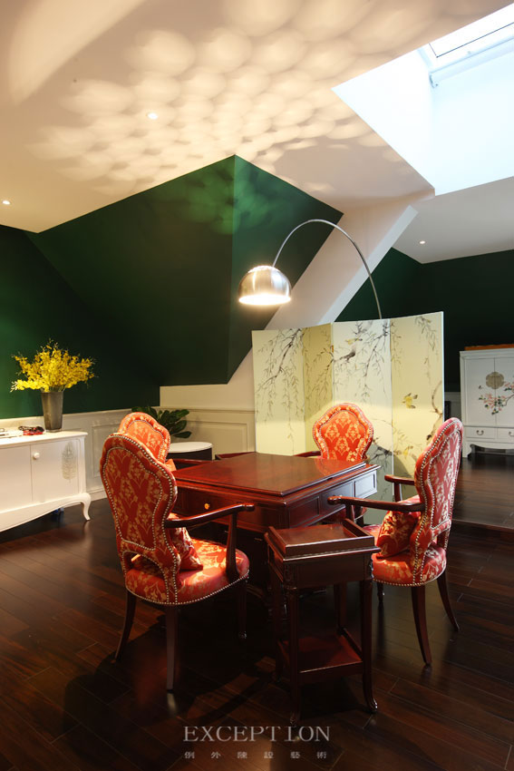 棋牌室的設(shè)計完全顛覆了傳統(tǒng)意義上的簡歐風(fēng)格,顏色選用夸張大膽,深綠色涂料在室內(nèi)設(shè)計中的運(yùn)用是一種突破。中式屏風(fēng)里蘊(yùn)含的那一派鳥語花香,為沉穩(wěn)的氣氛營造了躍動感,幽幽古韻,淡雅脫俗。一盞釣魚燈剛好垂照在麻將桌上,更有俏皮的燈光穿過燈罩上的小孔射在天花板上,造成水光粼粼的境象,整個空間美輪美奐。