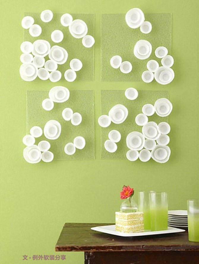 圖一:你能想象只用白紙跟圖釘就能打造出這樣一條“花帶”么,把白紙裁剪成大小不一的圓形充當(dāng)花瓣,注意邊緣也要剪成鋸齒狀,同時(shí)你還可以將白紙適當(dāng)彎折成適當(dāng)?shù)幕《?,這樣看起來會(huì)更加神似,后再用彩色圖釘將花朵固定,選擇不同的大小錯(cuò)落排列,這樣一款“花帶”藝術(shù)墻就大功告成啦!圖二:還記得你喜歡的CUP CAKE 嗎?將“紙杯”疊放、不規(guī)則排列就做成四幅一組的立體掛畫了。你一定有特別喜歡的彩色卡紙,學(xué)習(xí)圖4、5那樣包在木板表面,然后進(jìn)行比例組合,就是一組漂亮的作品啦。當(dāng)然,像圖6那樣的剪貼畫也是一個(gè)簡單的好方法,并且題材選取恰當(dāng)還能夠充滿故事性及趣味性。
