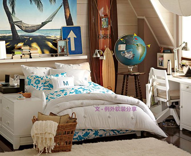 款主題鮮明:色調(diào)上以玫紅為主,灰色床品及彩色地毯作為襯托,在圖形元素上選取幾何圖案來裝飾整個空間,現(xiàn)代感十足,整體給人充滿活力的感覺。第二款以藍(lán)白搭配為主色調(diào),配合沙灘主題掛畫、沖浪漫以及插著小旗子的地球儀,營造了海濱小屋的感覺,充滿新鮮與冒險。第三款就更具有童話色彩了,讓人聯(lián)想到阿拉公主的故事,黃色與藍(lán)色勾勒了一個清新淡雅的背景,而玫紅的家私又帶來傲嬌的女王氣質(zhì)。第四、五款主要展示的是梳妝臺區(qū)域,一個純白的世界為女孩營造了一場唯美的夢境,容納著說不出的浪漫情懷。