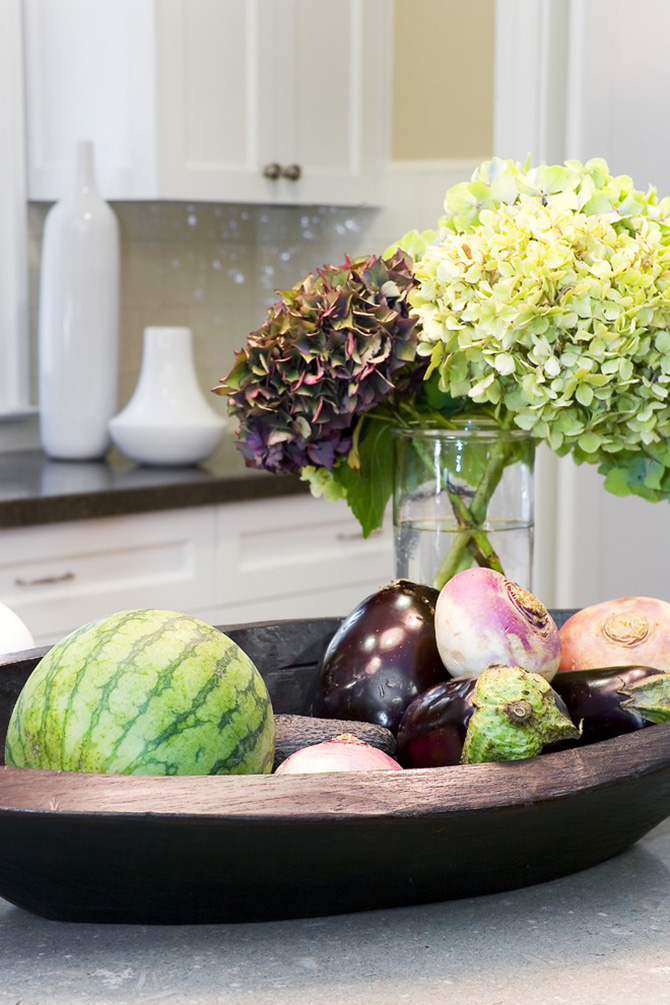 綠葉看似輕描淡寫卻有著一絲不茍的清晰脈絡(luò),在簡單的玻璃花器中釋放自然的生氣,只為襯托滿目的繡球玲瓏。彩色花團(tuán)與墨綠枝葉、花瓶的反光與背景的恬淡,形成極為錯(cuò)落有致的色調(diào)對(duì)比。